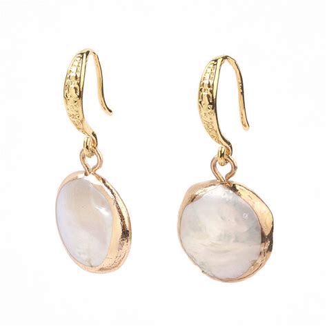 Plated Natural Baroque Pearl Keshi Pearl Beads Dangle Earrings, With Brass Finding, Flat Round, Golden, 30mm Pearl