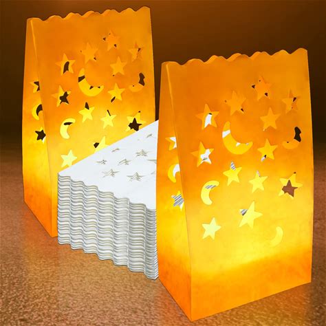 70PCS White Luminary Candle Bags Stars Moon Cutout Flame Resistant Luminaries Bag Christmas Candle Bags Paper Lantern Bags For Halloween Weddings