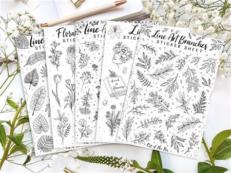 Lineart Sticker Sheet Bundle, Set Of 5 Floral Sticker Sheets, Journaling Stickers Line Art, Black And White Stickers Lineart