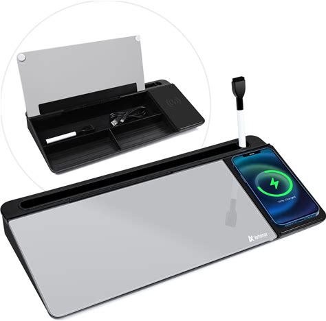Varhomax Glass Desk Whiteboard With Wireless Charger, Desktop Dry Erase White Board With Storage, To Do List Memo Notepad For Home And Office