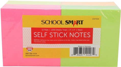 School Smart Removable Self-Stick Adhesive Notes, 3 X 3 Inches, Assorted Neon Colors, 100 Sheets, Pack Of 12 | Durable