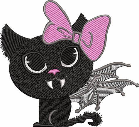 Cute Halloween Kitty Embroidery Design, Black Vampire Bat-Cat With Wings, Machine PE Files In 3 Sizes