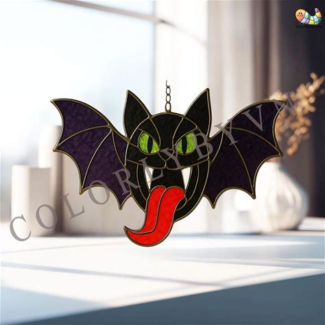 Bat Cat Stained Glass Pattern With Wings And, Halloween Suncatcher Template, Spooky Cat With Wings DIY Glass Art PDF PNG (L47HA)