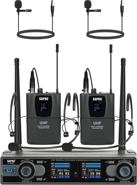 SGPRO Dual Channel Wireless Microphone System With Two Bodypack Transmitters, Two Headset Micriophones And Two Lavalier Mics For Live & Recording Of