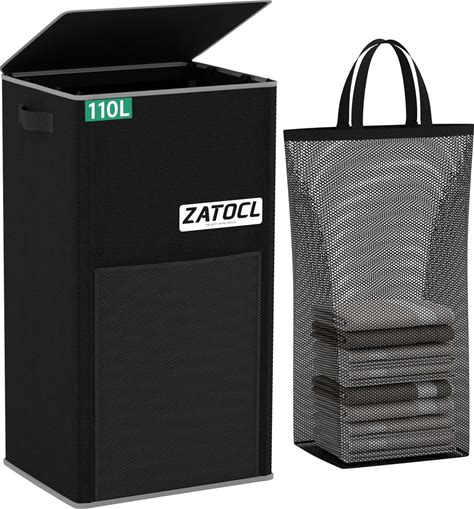 110L Laundry Hamper With Lid With Washing Bag Front Mesh Bag, Large Tall Laundry Basket, Collapsible Dirty Clothes Hampers For Bedroom Aesthetic, Bathroom, Dorm, Laundry Room - Easy Carry, Black