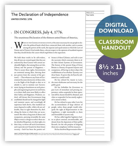 Declaration Of Independence (United States | 1776) -- Digital Download -- Classroom Handout -- 8.5 By 11 (Letter-Size) Printable For Teachers