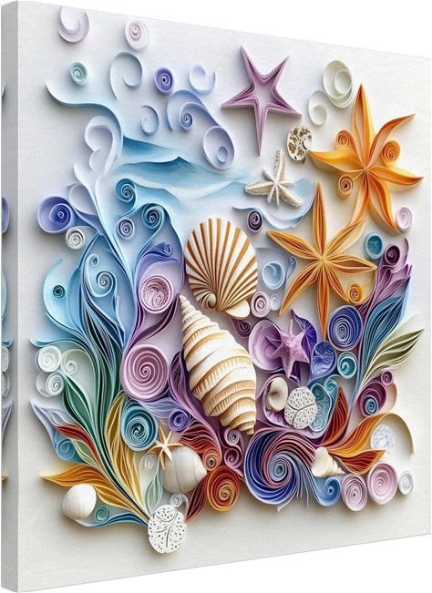 Seashells And Starfish By The Shore, Paper Quilling Artwork Of Ocean Life And Shells, Quilled Paper Design Canvas Print, Paperquilling