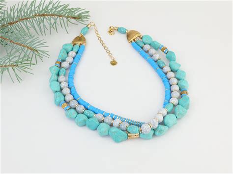 Nakamol Blue Layered Beaded Necklace, Turquoise Stones, White Accents, 8 Inches Long, Statement Boho Necklace, Handmade Jewelry,Gift For Her