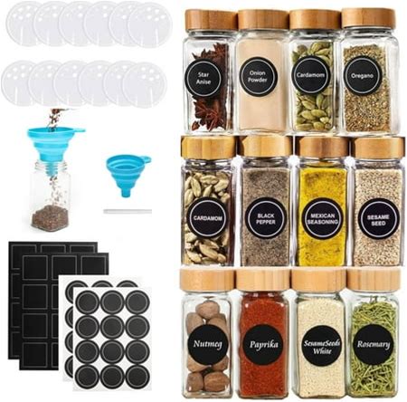 AOZITA 14 Pcs Spice Jars With Bamboo Lids - 4Oz Square Spice Bottles With Spice Labels, Shaker Lids, Funnel