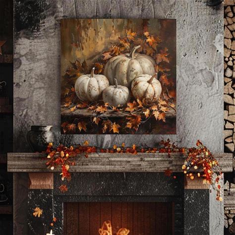 White Pumpkin And Autumn Leaves Still Life Canvas Wall Art, Fall Home Decor, Rustic Harvest Painting, Thanksgiving Decor For Gathering