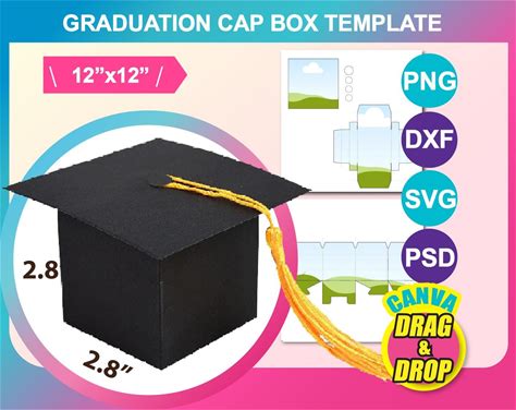 Graduation Cap Box Template, Canva, PSD, SVG, DXF, Png, Ms Word, 12"X12" Sheet, Printable