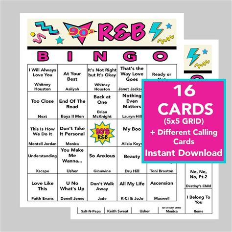 90'S R&B Music Hits, Soul Music, 76 Songs, Digital Download, Bingo Games, 16 Different Bingo Cards, Spotify Playlist Included