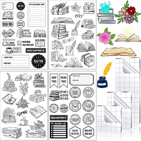 4 Sheets Vintage Book Reading Label Rubber Clear Stamps Set For Card Making And 3 Pcs Acrylic Stamp Block Tools With Grid Lines Transparent Book