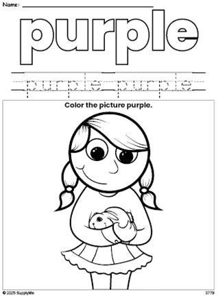 Girl Color Purple Coloring Page And Color Worksheet, Purple Worksheet For Preschoolers To Learn Colors, Printable PDF