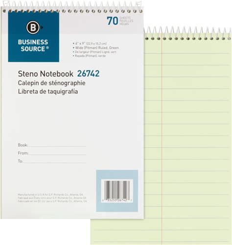 Business Source Steno Notebook - 70 Sheets - Wire Bound - Pitman Ruled Margin - 6" X 9" Sheet Size - Green Paper - Stiff-Back - 1 Each BSN26742