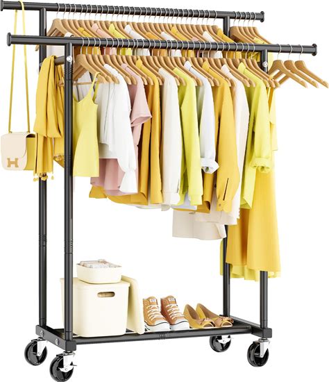 HYSEYY Double Rods Clothes Rack, Rolling Clothing Rack For Hanging Clothes Portable Wardrobe Rack, Metal Garment Rack Sturdy Coat Rack For Bedroom
