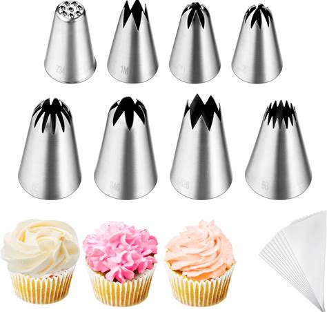 Kasmoire 8Pcs Large Piping Tips Set,Stainless Steel Icing Tips With 10 Disposable Pastry Bags For Cake Decorating