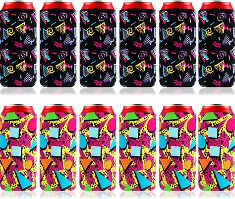 12 Pieces Retro 80S 90S Vintage Slim Can Cooler Bottle Can Sleeves Memphis Fashion 80S Neon Can Cooler Sleeves Retro Party Supplies