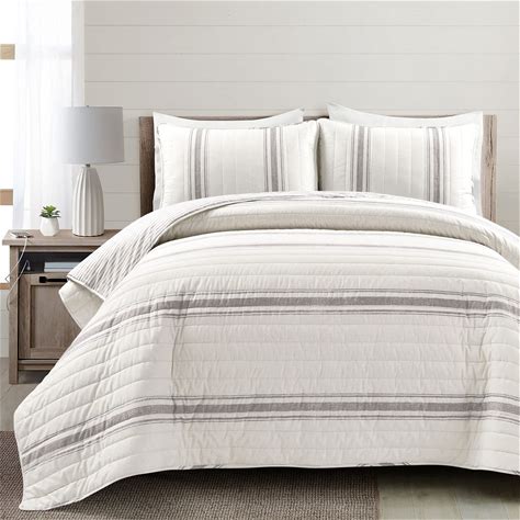 Lush Decor Farmhouse Stripe Reversible Cotton Quilt Queen Size 3 Piece Set Full/Queen Gray - Farmhouse Bedding Set Queen Quilt - Striped Bedding