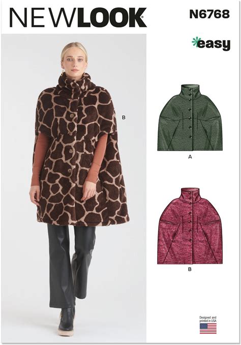 New Look N6768 6768 Pattern UNCUT Easy Semi Fitted Unlined Cape Convertible Collar Lower Side Front Seams Pockets Hip Length Knee Size S-XXL
