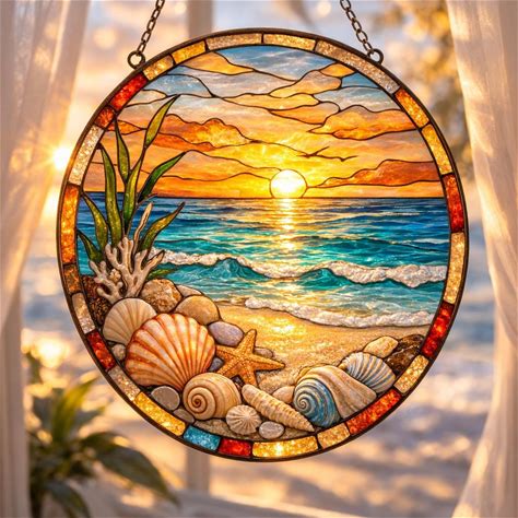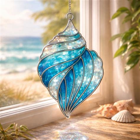Seashell Stained Glass Suncatcher, Coastal Beach Window Hanging Decor, Handmade Ocean Gift