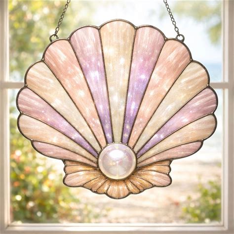 Pearl Seashell Stained Glass Suncatcher, Pastel Shell Window Hanging, Coastal Sun Catcher Decor