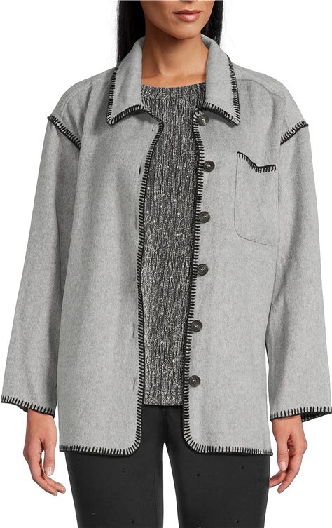 Intro Embroidered Whipstitch Greyblack Point Collar Long Sleeve Button-Front Shirt Jacket, Womens, L, Grey/Black Whipstitch