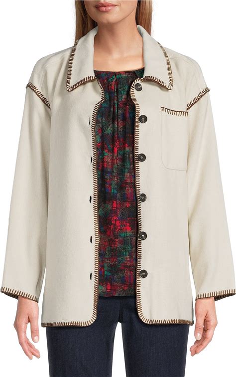 Intro Embroidered Whipstitch Point Collar Long Sleeve Button Front Shirt Jacket, Womens, XL, New Natural Pearl/Capuccino Whipstitch